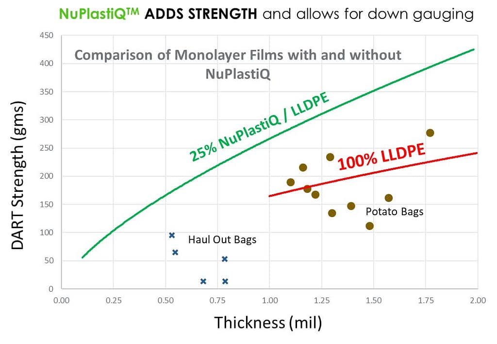 NuPlastiQが配合されたLLDPEフィルムは落下ダーツ衝撃強度が大幅に向上し、フィルムブローのバルブ安定性が非常に高く、より薄いフィルムの製造が可能です。